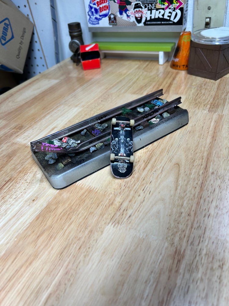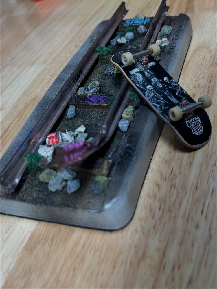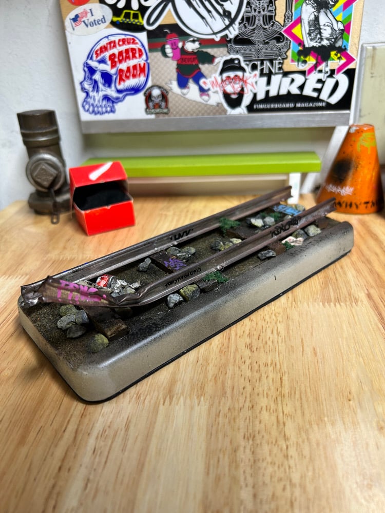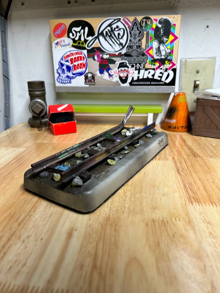 9inch concrete base with wood ties and metal train rail with one side bent up for that pole jam experience