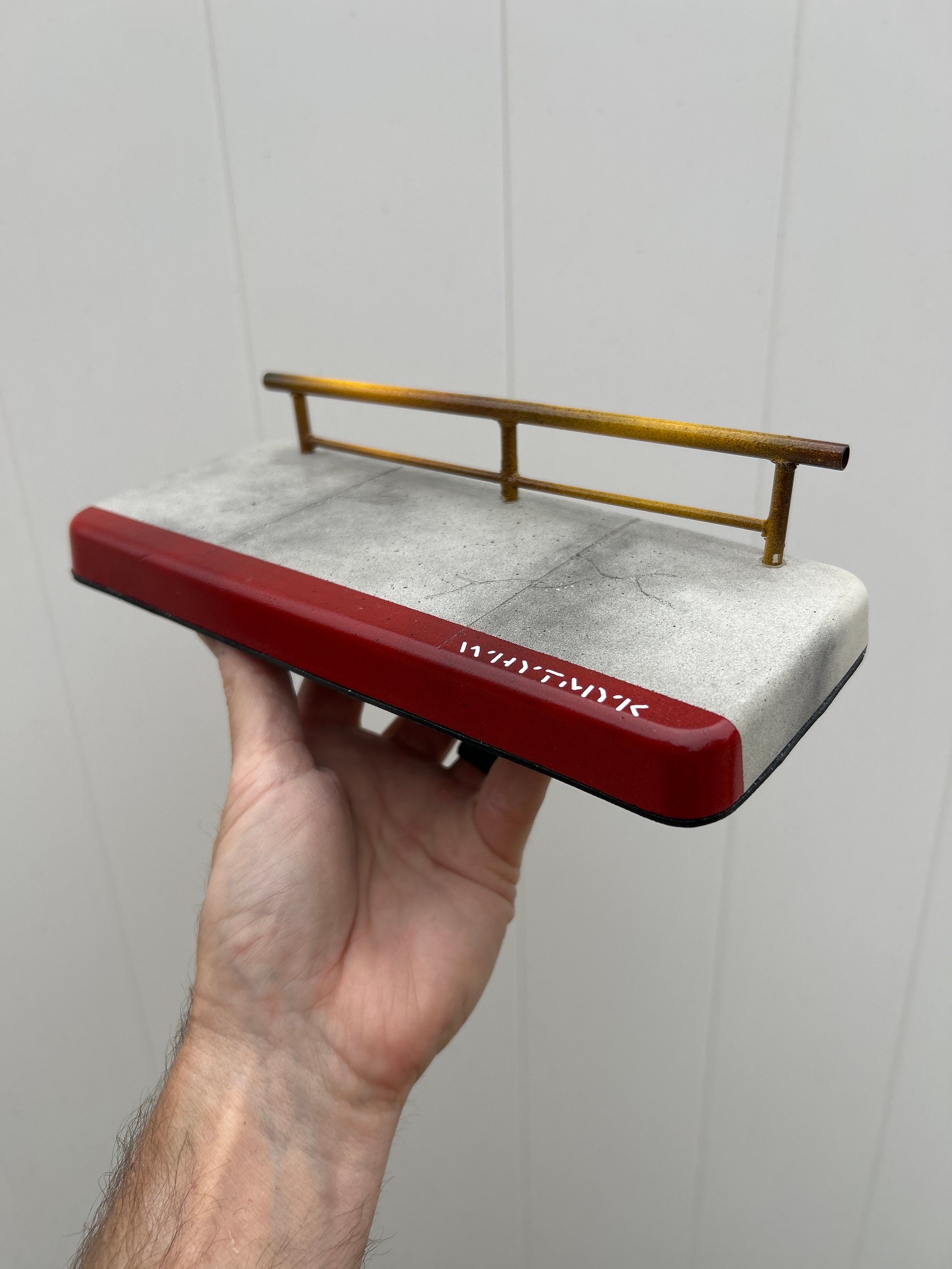 9 inch side walk with 2.5 inch chain link fence. Includes hand painted No Fingerboarding sign and foam bottom